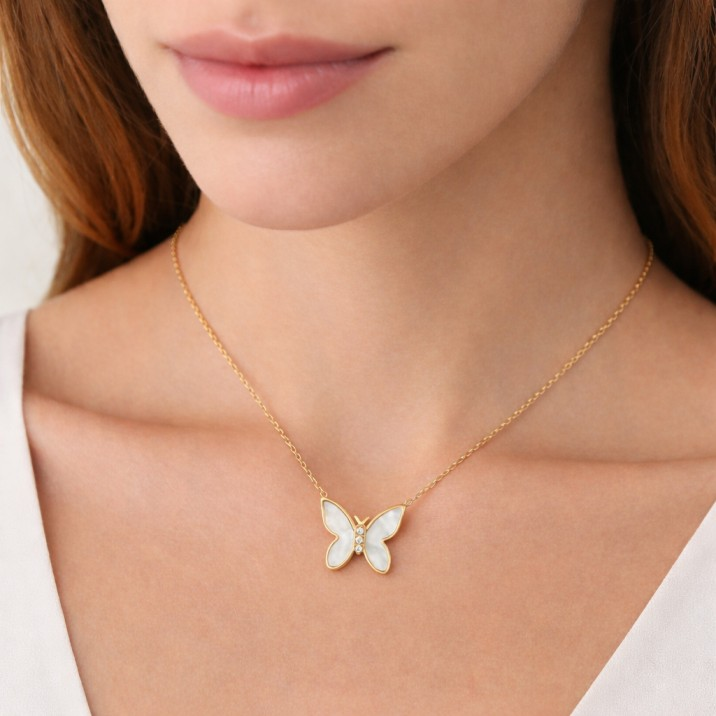 This necklace combines two visual elements that work particularly well together. The smooth snake chain provides a clean base while the butterfly charm introduces a decorative focal point.
