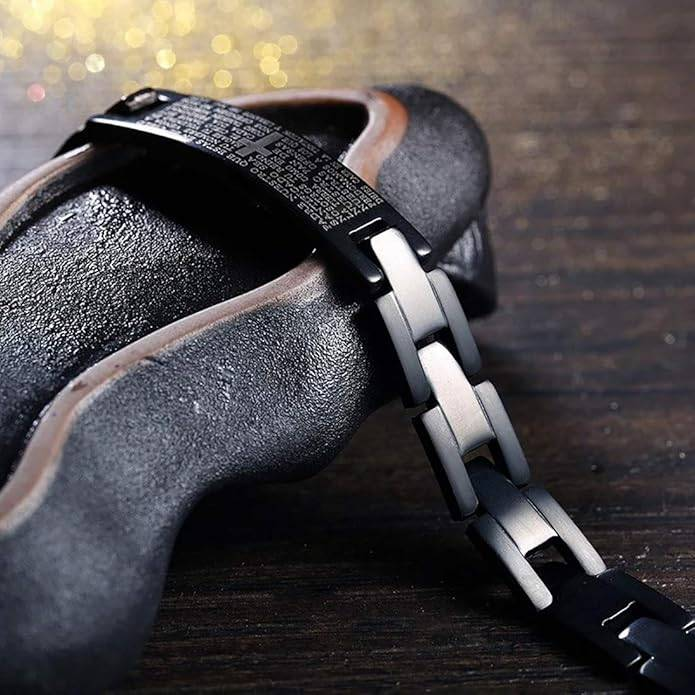 This bracelet combines a black metal chain with a central plate. The plate often features a cross or religious text, providing a spiritual connection for the wearer.