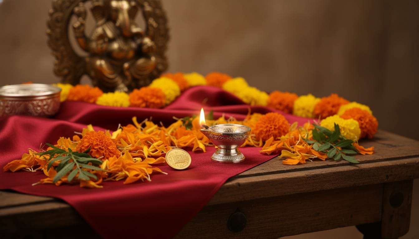 - Pooja essentials: small kalash, diya, coins, idols.