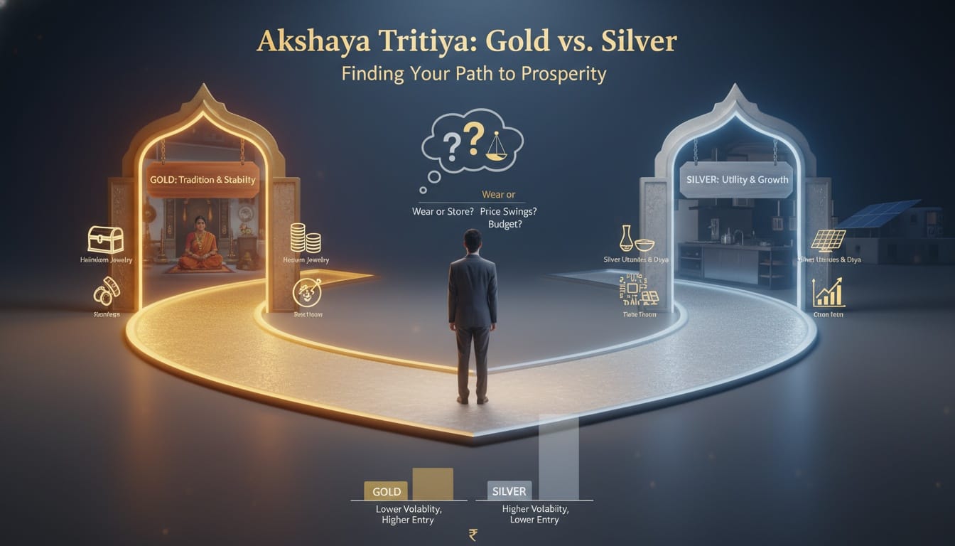 Most people buy blindly. Learn whether gold or silver is the smarter choice this Akshaya Tritiya. Compare value, volatility, usability, gifting, and budget tips to choose confidently.