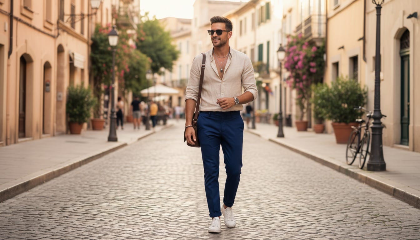 In India's warm climate, lightweight natural fabrics like cotton and linen are essential. Light colors such as white and beige help stay cool, while breathable footwear like leather sandals or loafers provide comfort without sacrificing style.