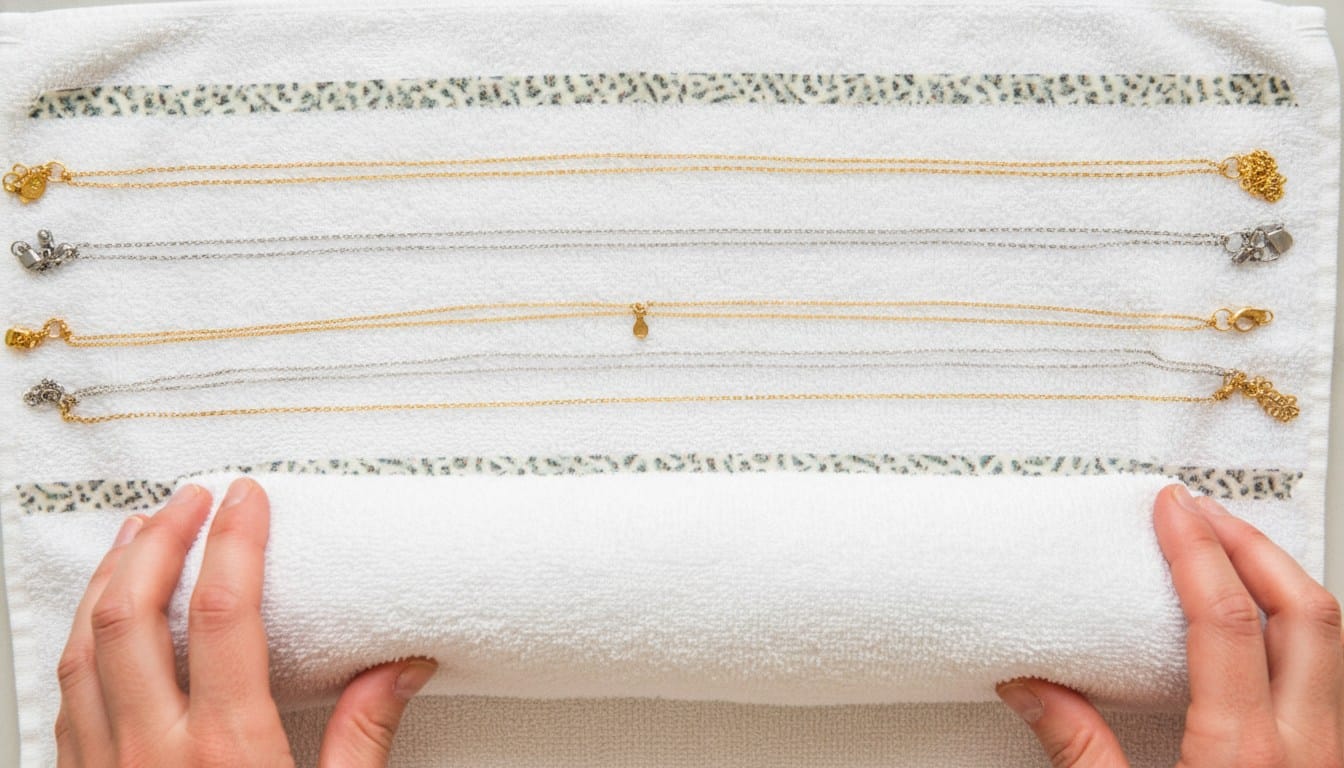 The towel or plastic wrap method relies on friction and pressure to "sandwich" jewellery in a fixed position. By rolling items inside a towel or pressing them between sheets of plastic wrap, you remove all space for the jewellery to move or tangle.
