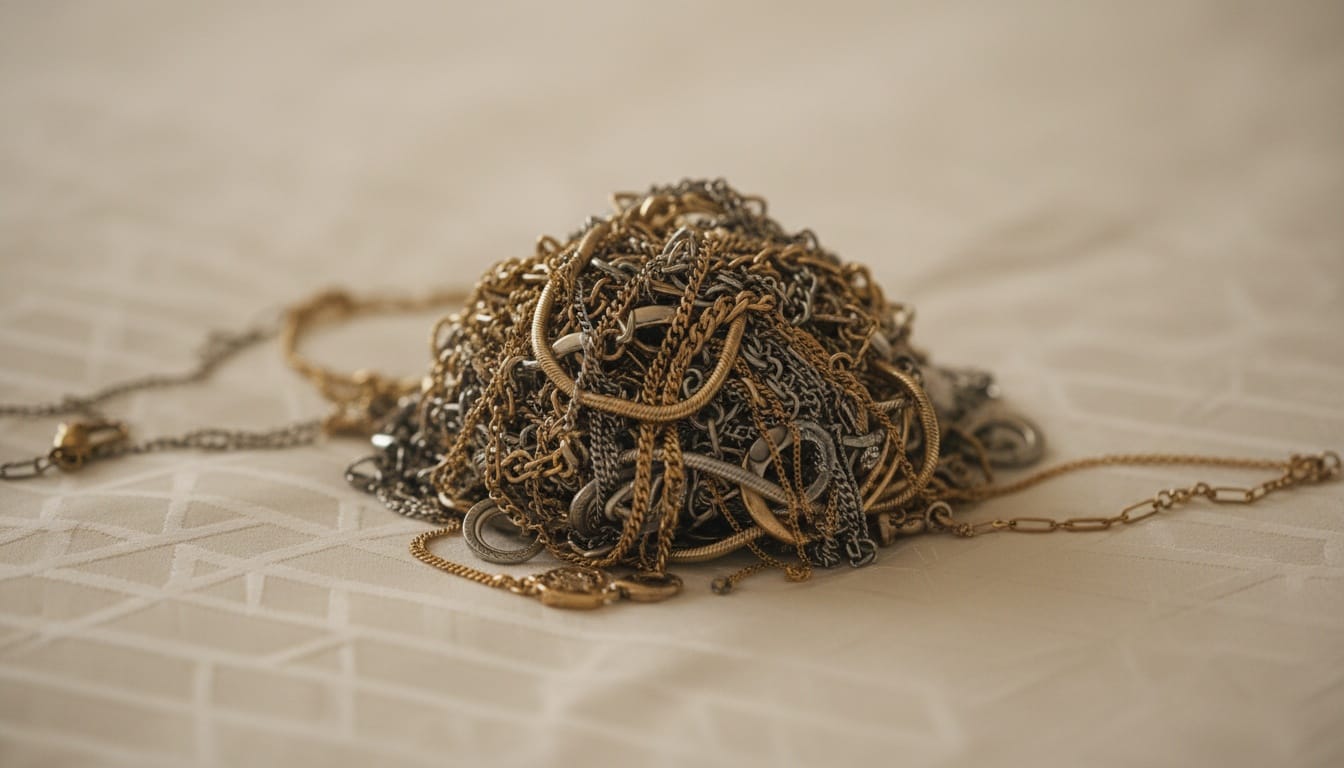 One of the biggest mistakes is leaving necklaces unclasped, which allows the two ends to find each other and form knots. Another common error is mixing heavy watches or bangles with delicate chains, as the heavier items can crush or scratch the smaller ones.