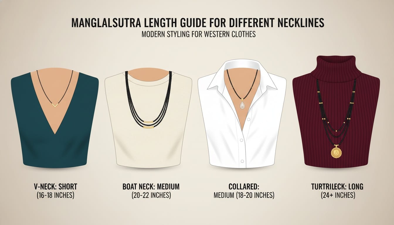 Learn how to wear a mangalsutra with western clothes. Discover 5 styling rules, length guides, and modern designs perfect for jeans, dresses, and office wear.
