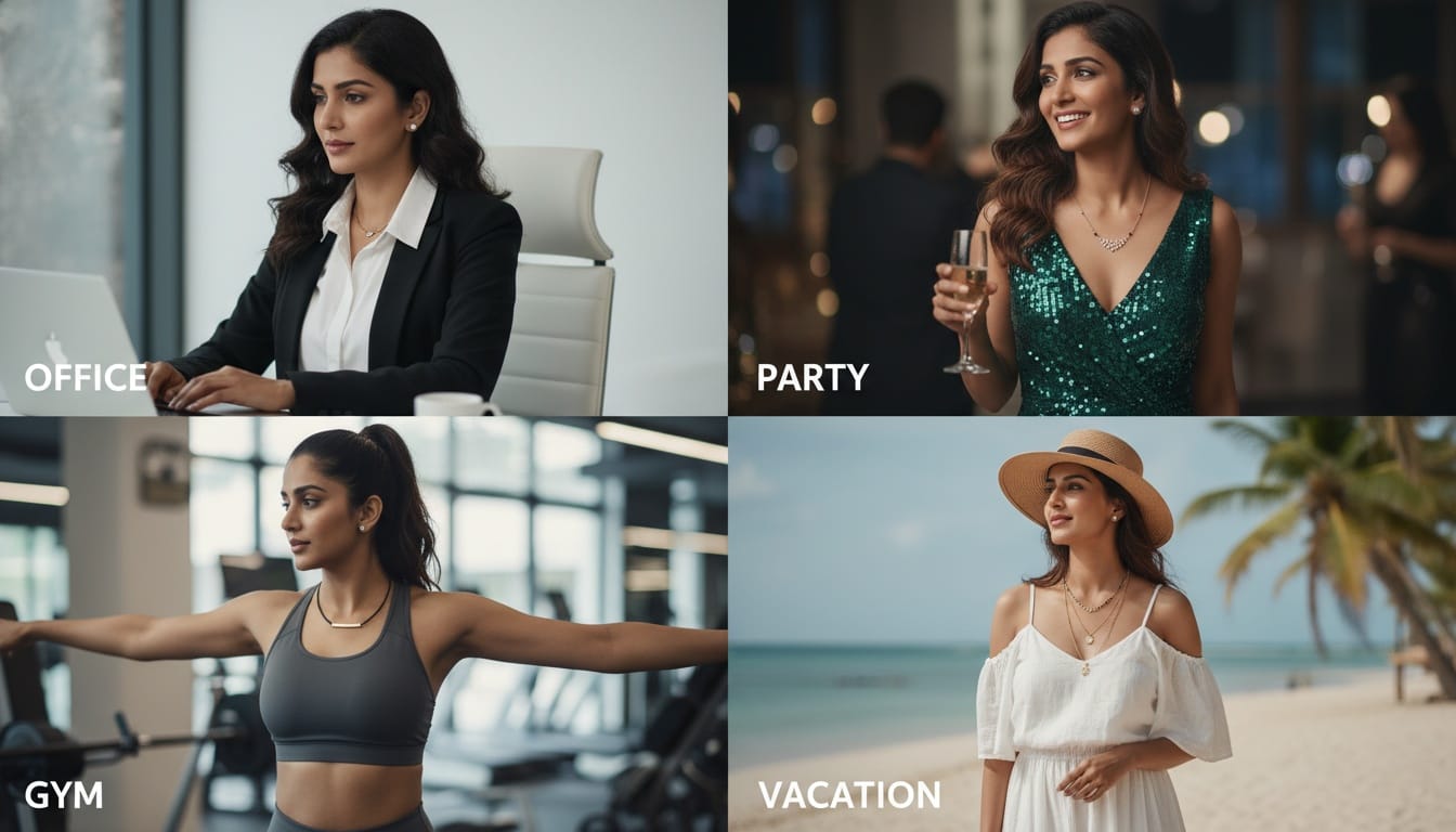 When you wear a saree or salwar kameez, a long chain works because those outfits have drapes and volume. Western clothes like T-shirts or blazers usually have a structured fit. A short mangalsutra stays visible near the neck and looks deliberate. It frames the face rather than getting lost in the fabric of your top. If you must wear a longer chain for religious reasons, wear it inside your shirt and layer a shorter fashion necklace on the outside to maintain a cohesive look. For more on this, read our guide on matching necklaces to necklines.