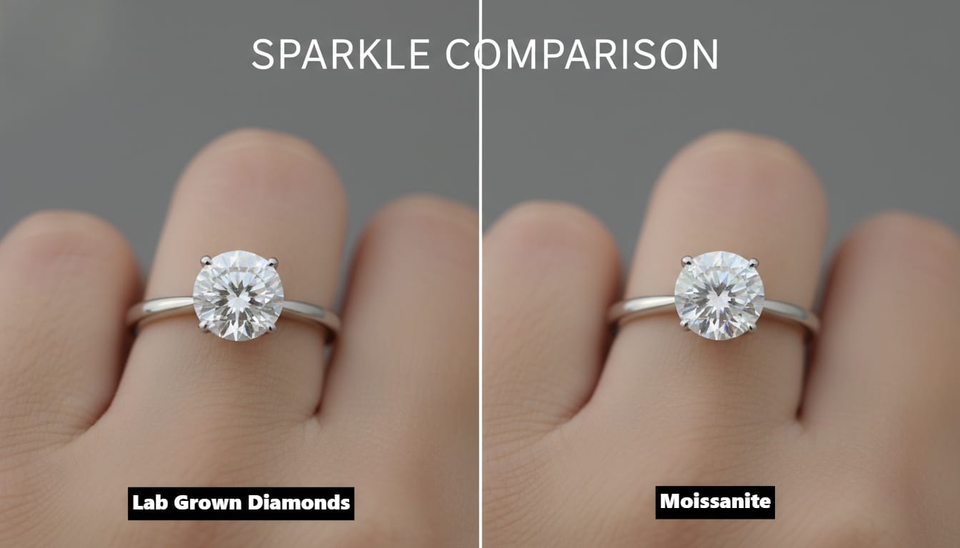 | Sparkle style | Clean white brilliance, classic diamond look | More fire and rainbow flashes, high sparkle |