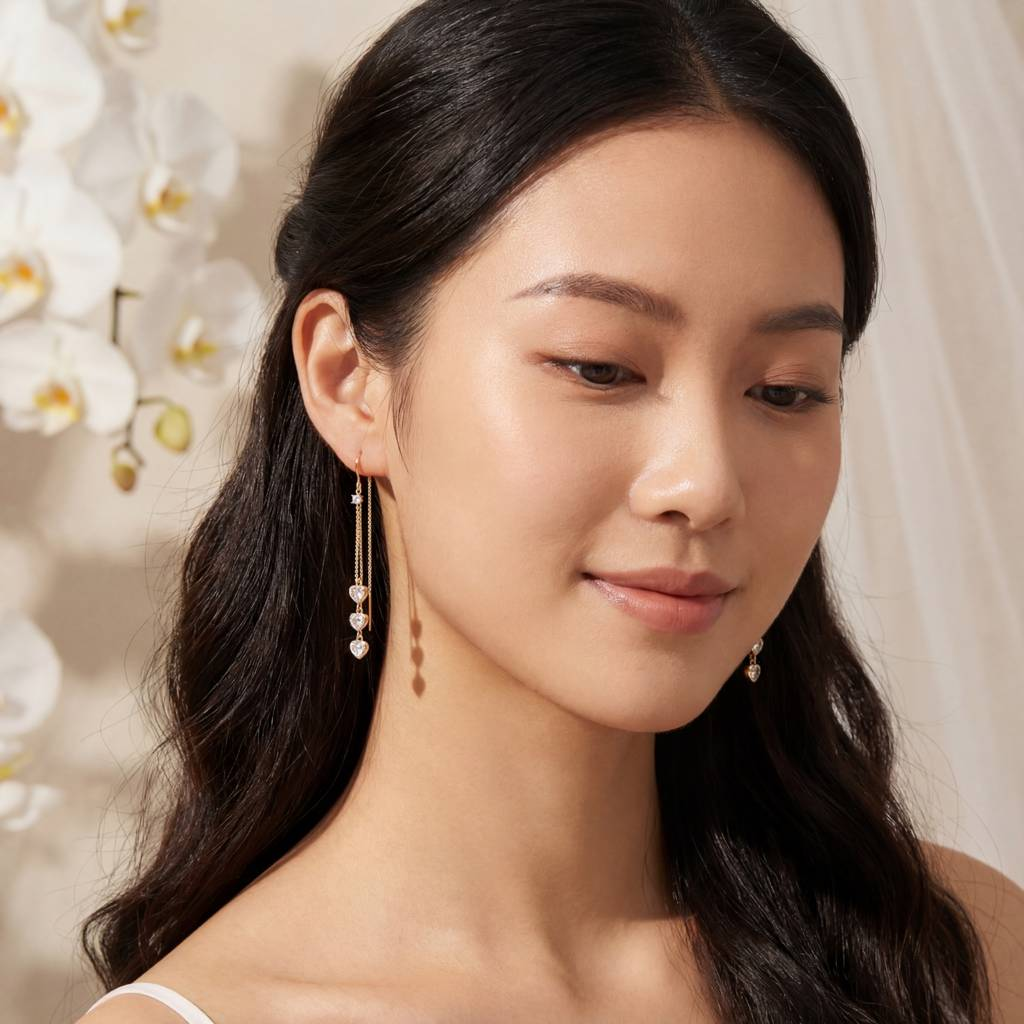 - Korean Triple Heart Crystal Threaders: With three delicate hearts and sparkling crystals, these threader earrings offer a romantic and modern look.