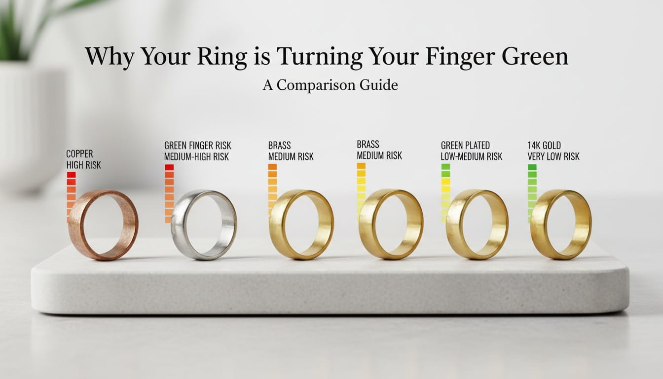 Gold is mixed with other metals to make it strong. 24k gold is pure but too soft for rings. 14k or 18k gold contains other metals like copper or nickel. If the percentage of copper is high enough, even a real gold ring can leave a mark. For a deeper understanding, you can read our Gold Purity Guide (24k vs 18k).