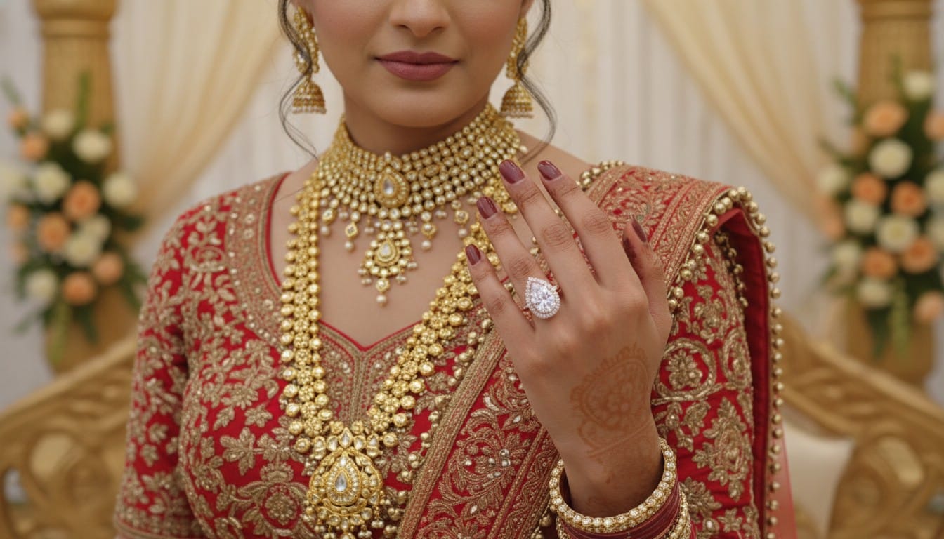 Yellow gold is the classic choice for traditional bridal sets like Kundan or Temple jewelry, while rose gold is increasingly popular for modern engagement rings and diamond settings.