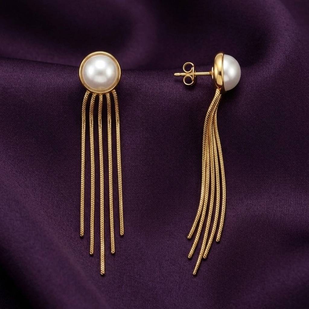 RACHIVA18K Gold Plated Pearl Bezel Stud Snake Chain Fringe Drop Earrings