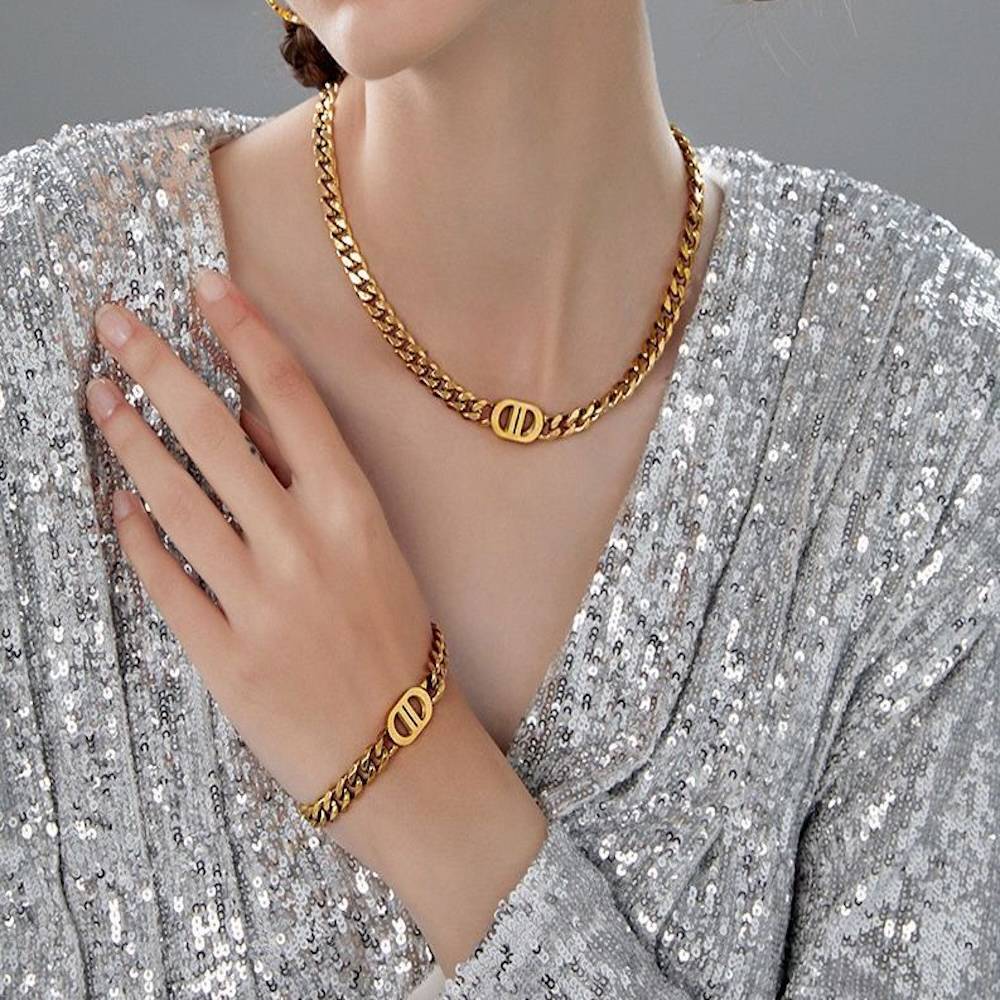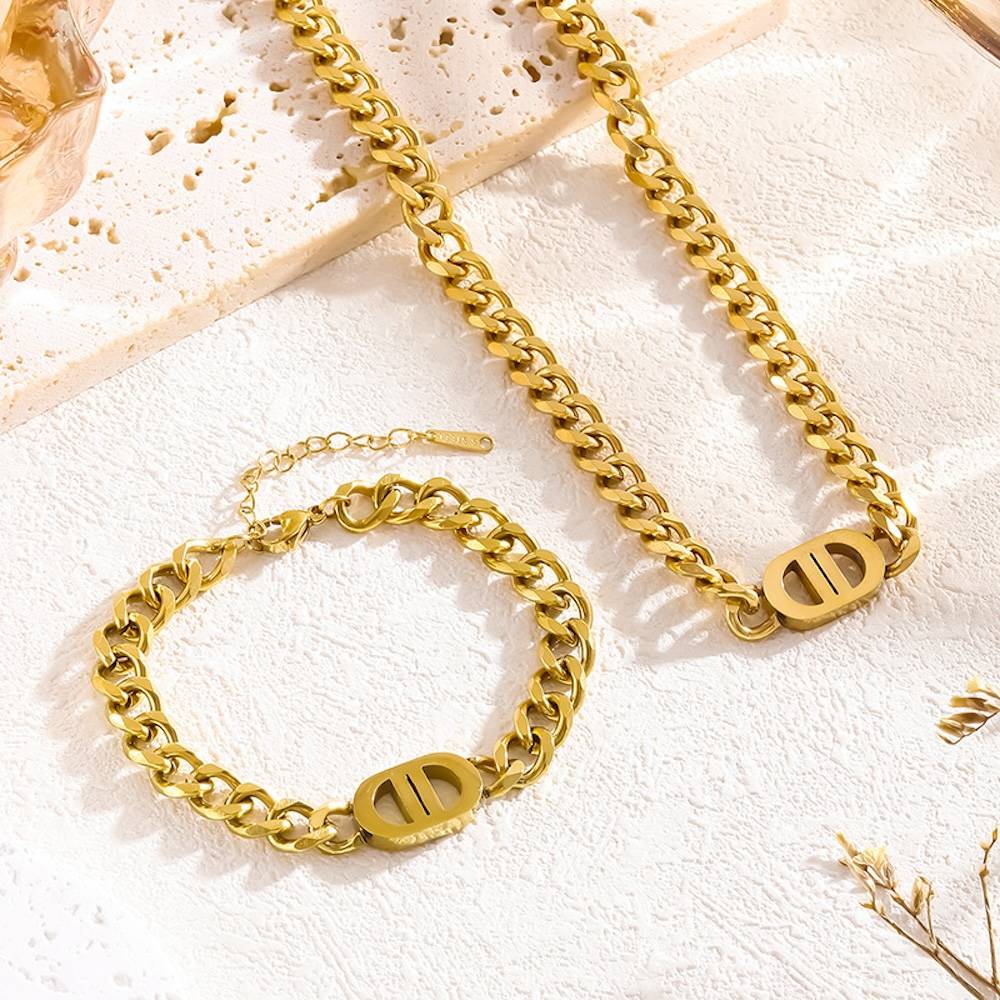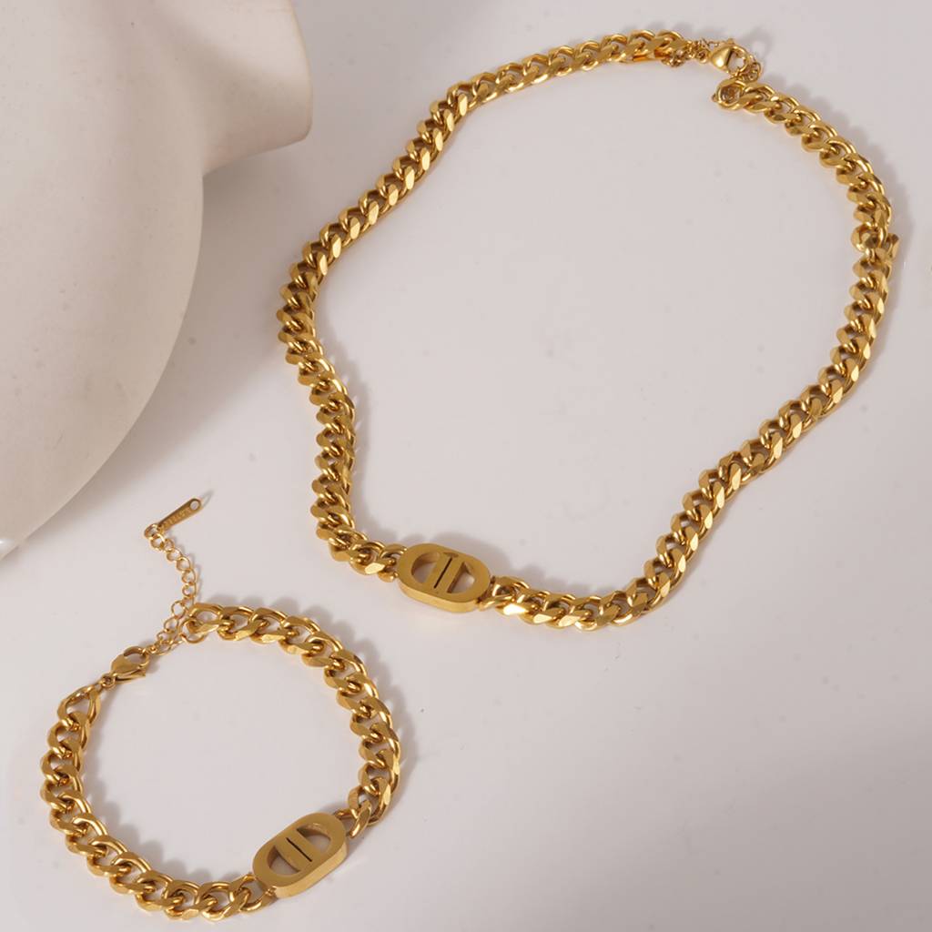 18K Plated Waterproof Antitarnish Link Necklace And Bracelet Set For Women : AMO0924NB689GC