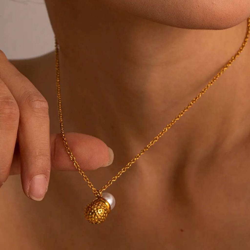 18Kt Gold Plated Textured Natural Shell & Pearl Pendant Necklace, Ratna Pathak : INRATNA