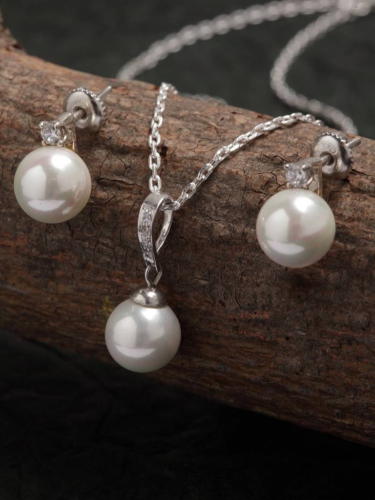 925 Sterling Silver Classic Pearl Pendant Earrings Chain Jewellery Set Gift For Women And Girls-Cspczp3E2 : CSPCZP3E2