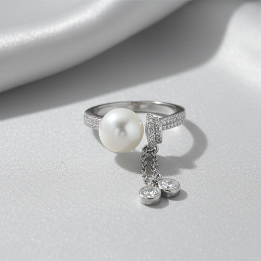 925 Sterling Silver Contemporary Pearl And Dangle Charm Ring High Polish Rhodium Jewellery For Women : AG0202-75-81