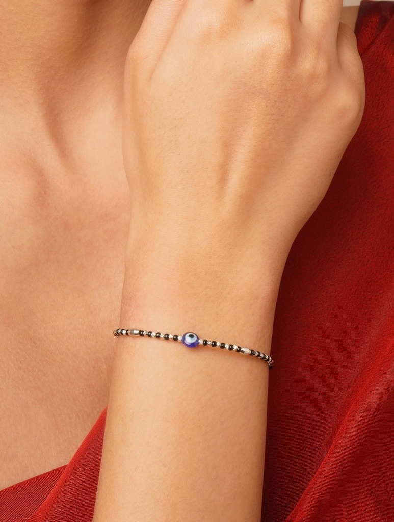 Arte Jewels925 Sterling Silver Evil Eye Black Beaded Bracelet (Adjustable)