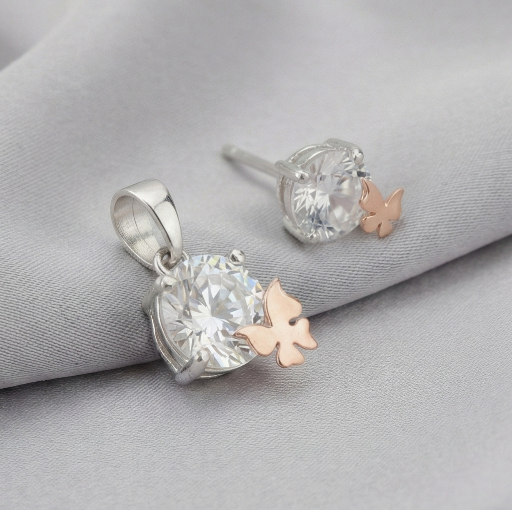925 Sterling Silver Solitaire Pendant & Earrings Set With Rose Gold Butterfly Jewellery For Women : AG02668080