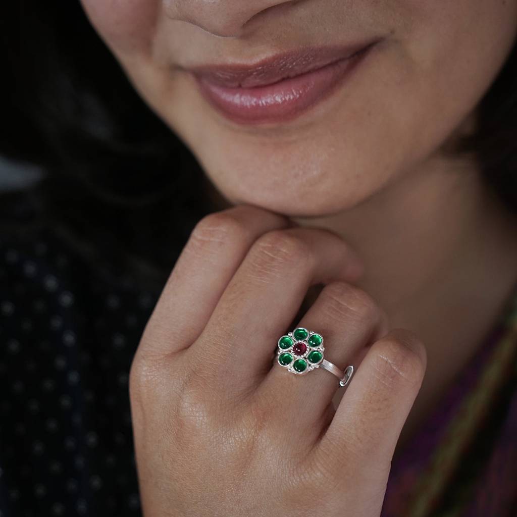 Bageecha Green Flower Ring | 92.5 Silver | Kempu Stones : silve_green_flower_ring_sep24
