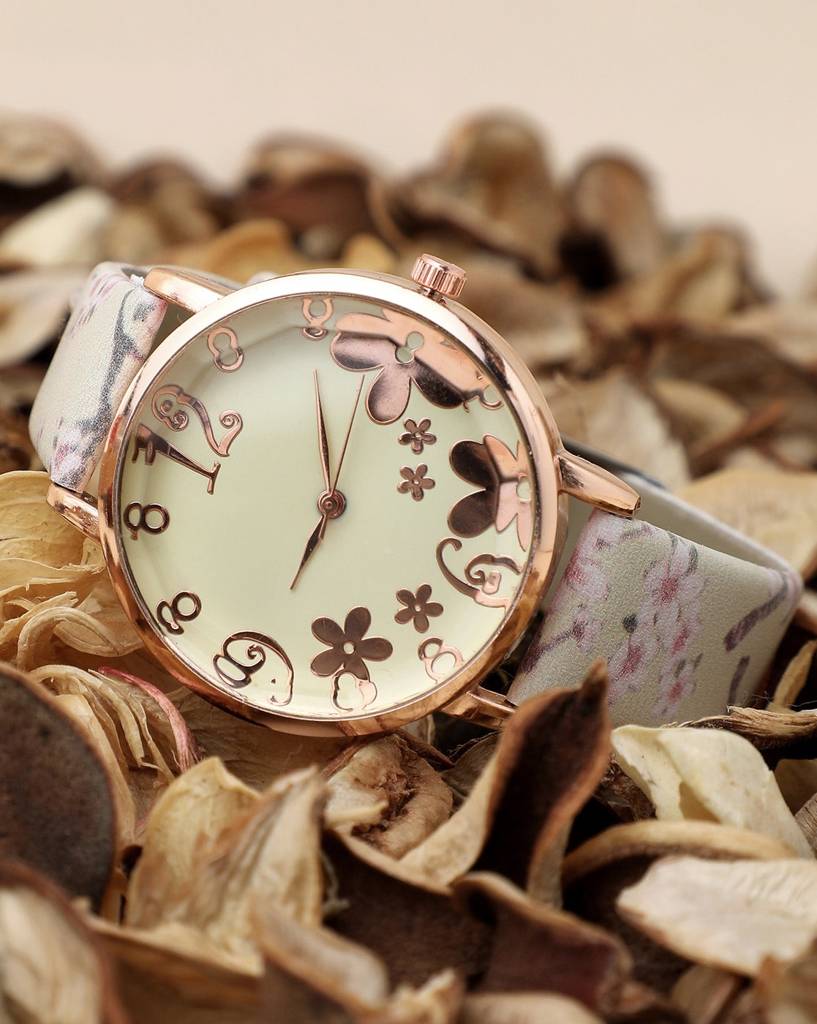 Beige & Champagne Gold Decorative Analog Round Dial With Floral Printed Leather Strap : HSWC1023