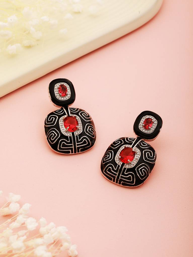 Black Enamelled Red Ad Studded Statement Drop Earrings : SJER2256