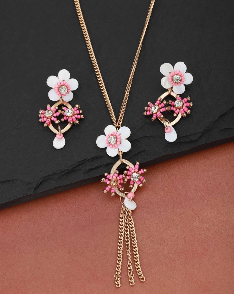 Carlton London Pink & White Gold-Plated Stone-Studded & Beaded Jewellery Set : FJS2933