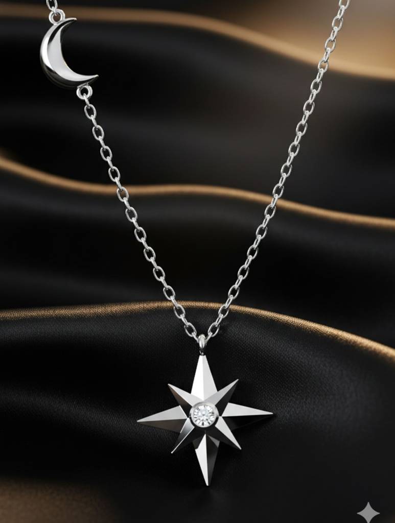 Celestial Star & Crescent Moon Moissanite Pendant Necklace In 925 Sterling Silver : SILLUXP001_S
