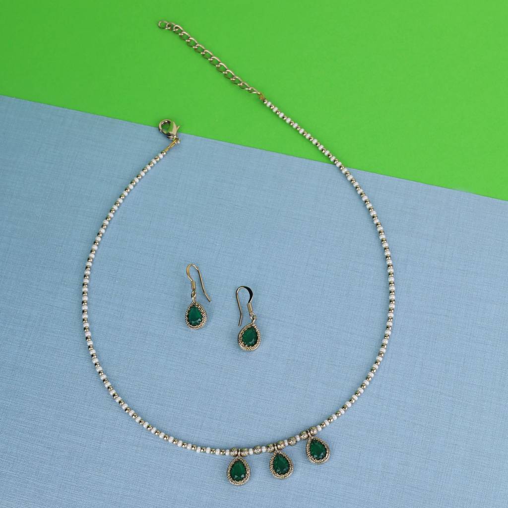 Charming Oval Shape Green Crystal Gold Plated Matinee Necklace Set (Mala) For Women : 6ML27_MD