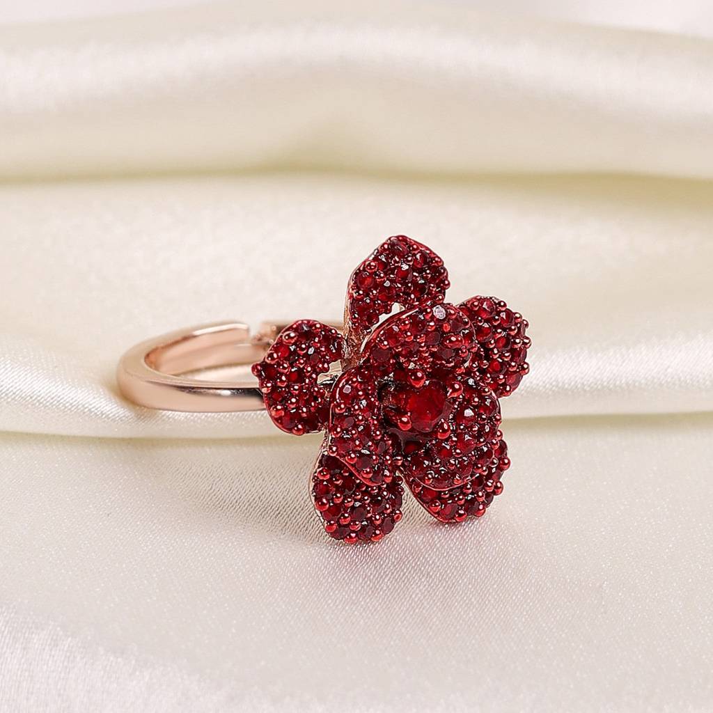 EsteleDazzling Ruby Red American Diamond Lightweight Rose Motif Adjustable Finger Ring With Luxurious Rosegold Finish For Women