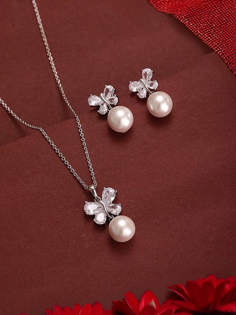 Saraf RS JewelleryElegant Pearl & Butterfly Pendant With Matching Earrings