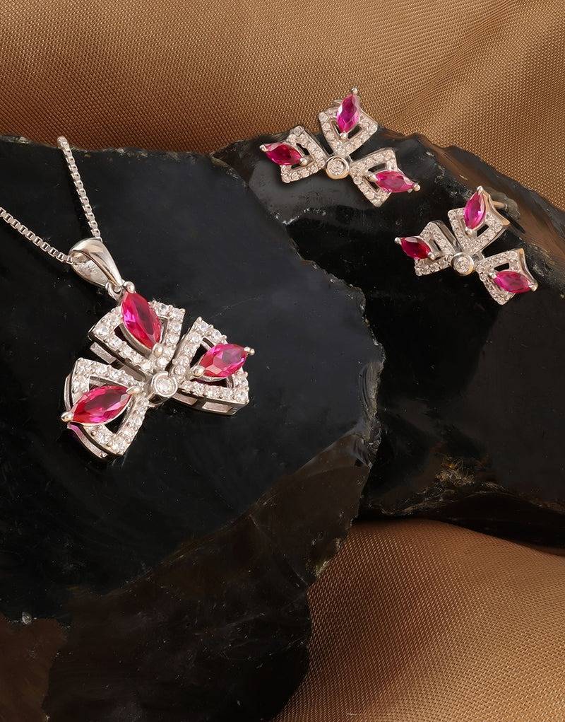 Elegant Pink Cz Stone Pendant & Earrings Jewelry Set : JS-10005-R