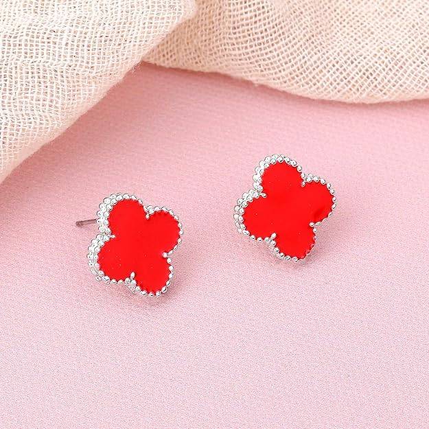 EsteleRhodium Plated Four Leaf Clover Designer Stud Earrings With Red Enamel For Women And Girls