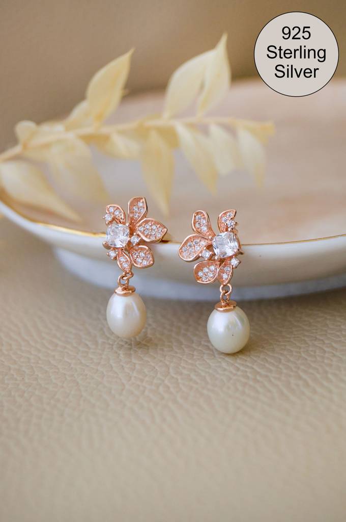 MannashEternal Bloom Pearl Drop Rose Gold Plated Sterling Silver Earrings