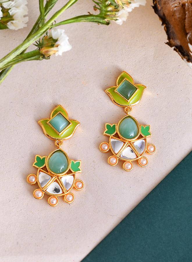 Forever More Green Enamelled Floral Pearls And Green Stones Earrings : 8905124498363