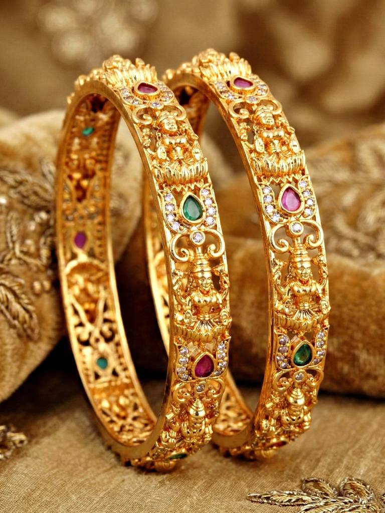 Gold Plated Laxmi Ji Temple Design Ad Bangle For Women With Pink & Green Stones | Traditional South India : 837-C1BG-2205-2-24