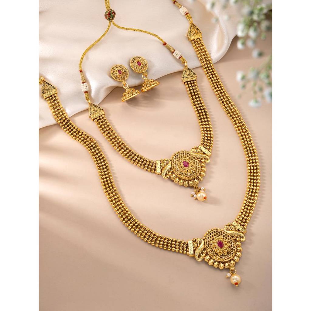 PeoraGold Plated Rani Pink Synthetic Stone & Pearl Studded Maharani Haar Short & Long Necklace With Jhumki Earrings Bridal Jewellery Set For Women