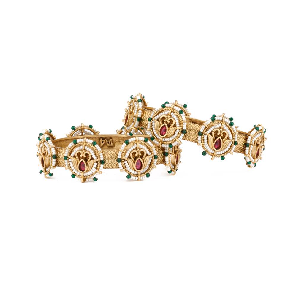 Gold Plated Red Onyx Stone Encircled With Pearls Bangles, Set Of 2 : VB138