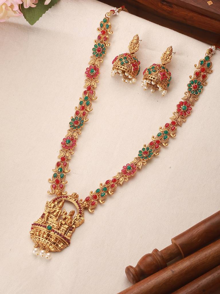 AatmanaGold-Plated Ruby & Emerald Stone-Studded Temple Jewellery Set With Pearl & Gold Beads