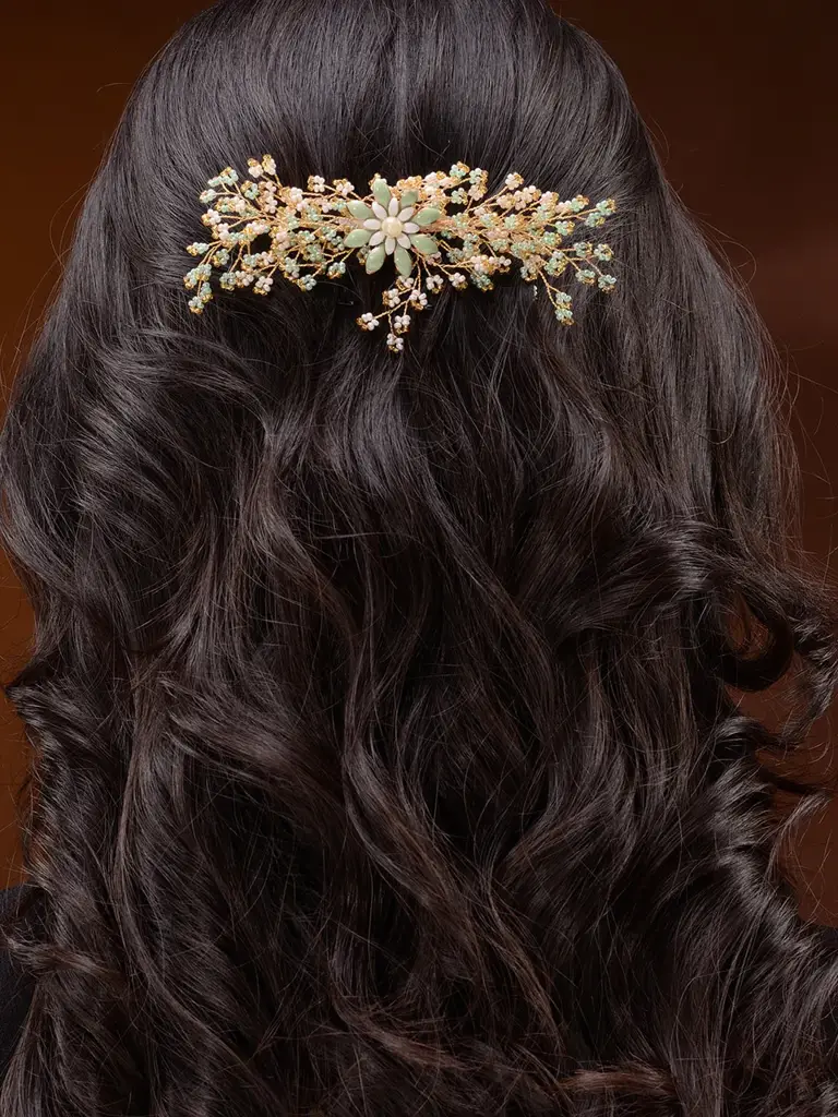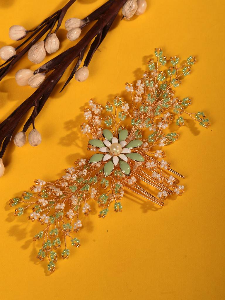 Gold Toned Green Pearl Beaded Bridal Hair Pin : SJHC1982