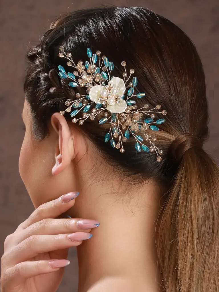 Saraf RS JewelleryGold Toned Mother Of Pearl Embellished Blue Hair Comb Pin (Free Size)