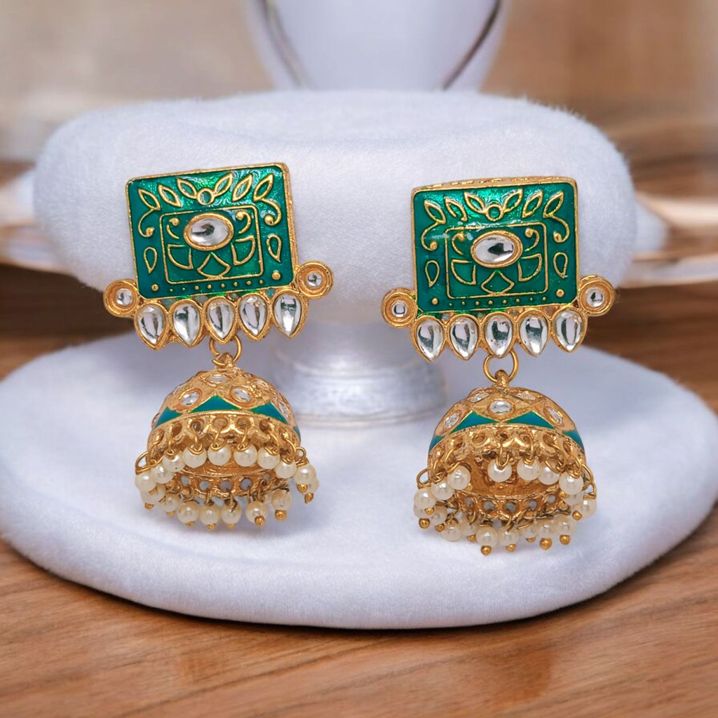 Green Meenakari Kundan Jhumka Earrings For Women | Gold Plated Ethnic Pearl Drop Earrings | Traditional & Festi : AST-EAR-0103