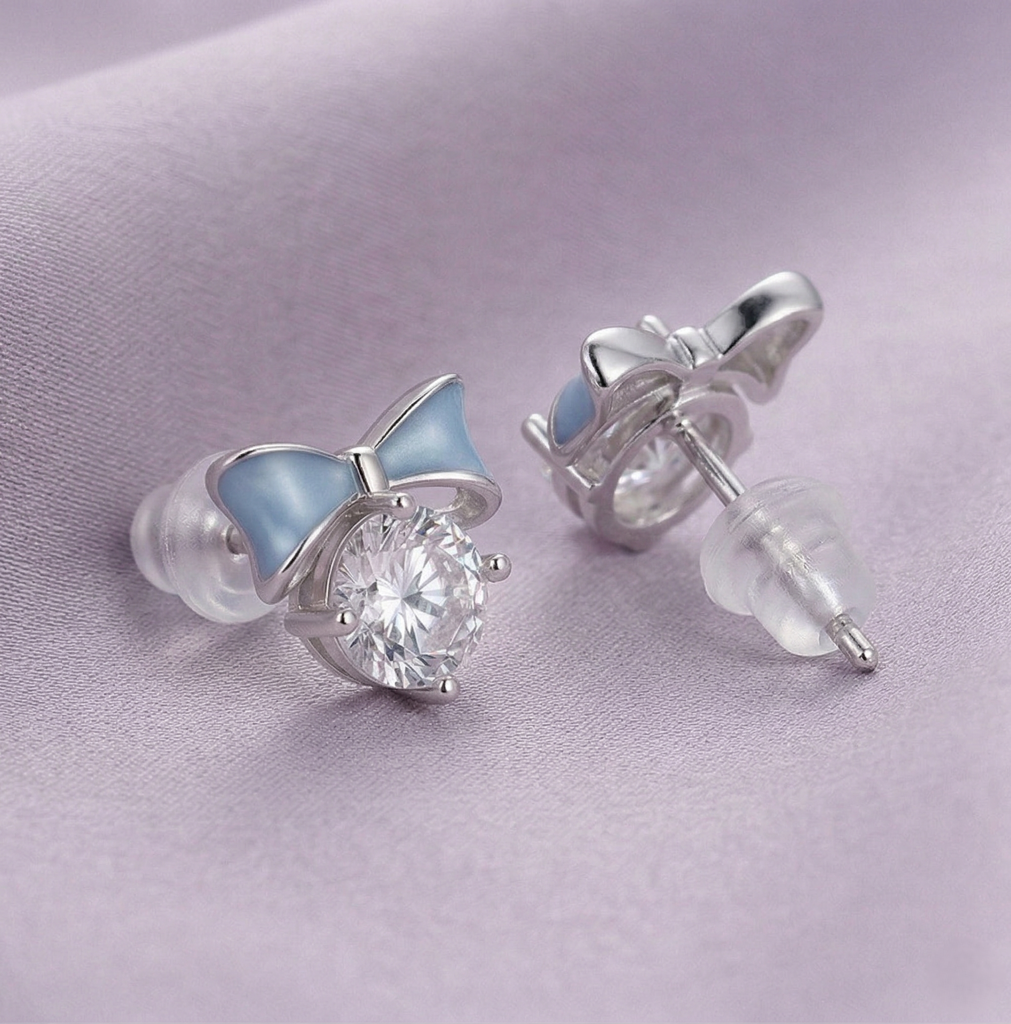 GIAMELuxe Collection - Blue Enamel Bow Solitaire Stud Earrings High Polish Rhodium Finish - Premium 925 Silver Fine Jewellery