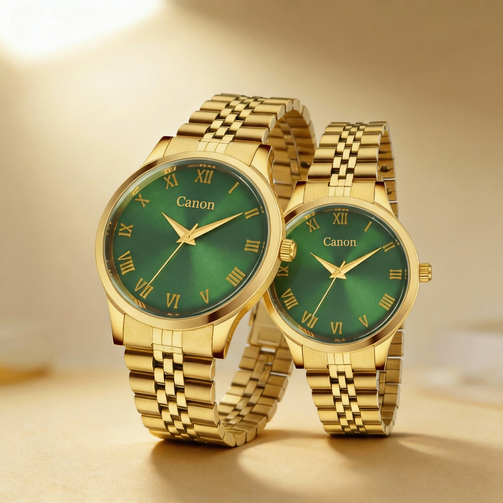 Canon QuartzLuxury Golden & Green Couple Watch With Roman Numerals Cn-485