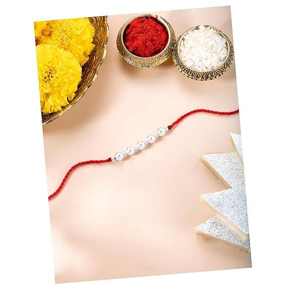 PeoraMens 925 Sterling Silver Pearls Studded Rakhi For Brother Bhaiya|Red Thread|Raksha Bandhan Hamper With Roli Chawal & Greeting Card