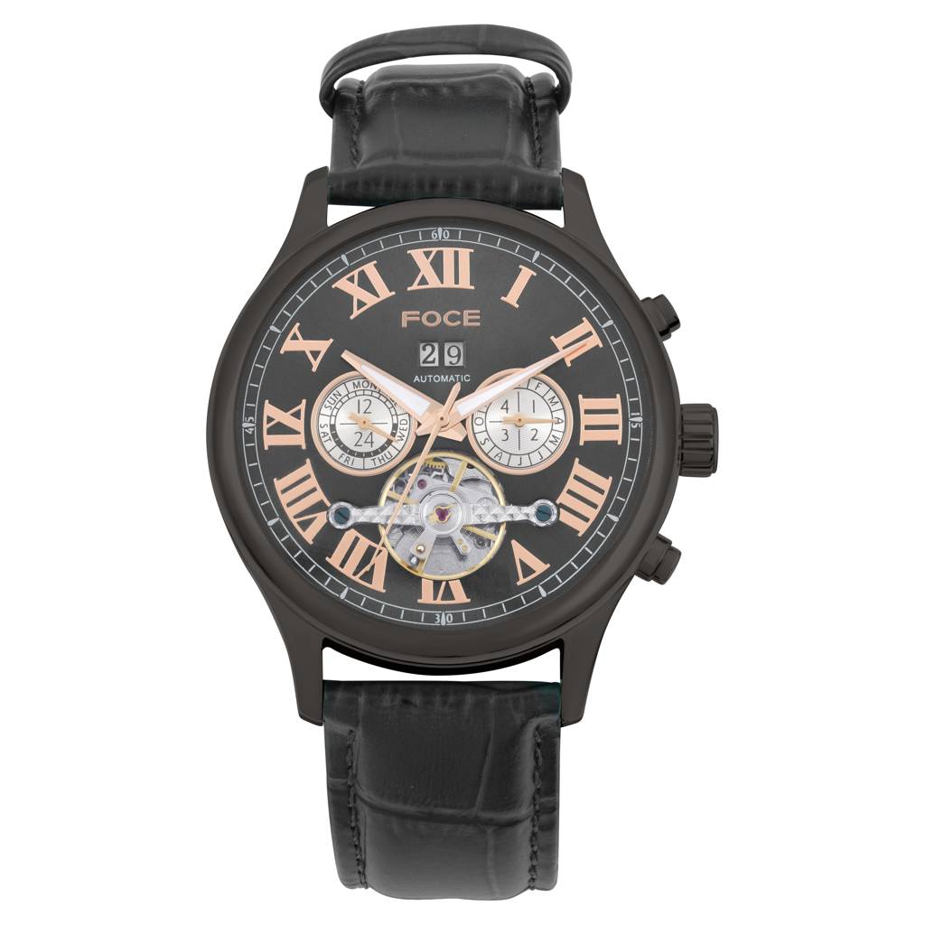 FOCEMen’S Automatic Stainless Steel Multifunction Watch | Month Subdial At 3, Day Subdial At 9, Date Window At 12, Open Heart At 6, Analog Wristwatch With Leather Strap