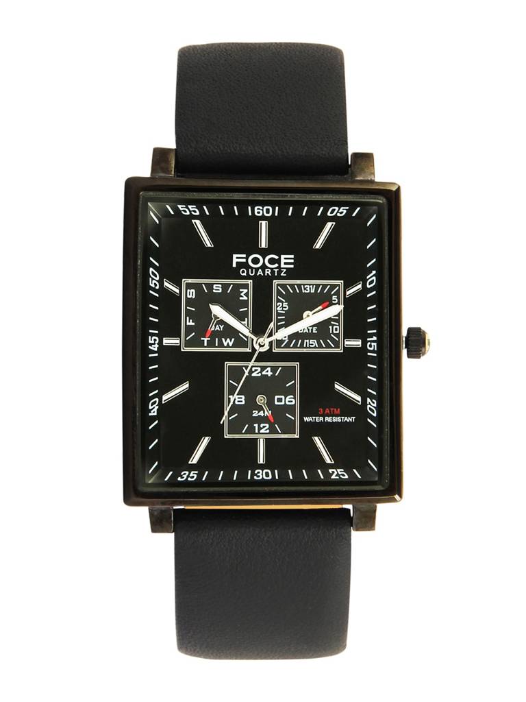 FOCEMen'S Sleek Rectangular Watch, Leather Strap, Separate Day, Date, 24 Hour Subdials - Model F722Gbl