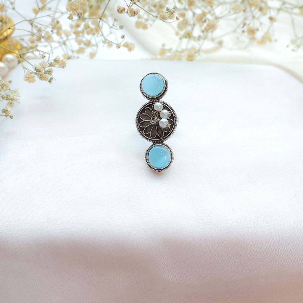 Oxidized Double Stone Ring With Sky Blue Accents And Pearls : FW-44