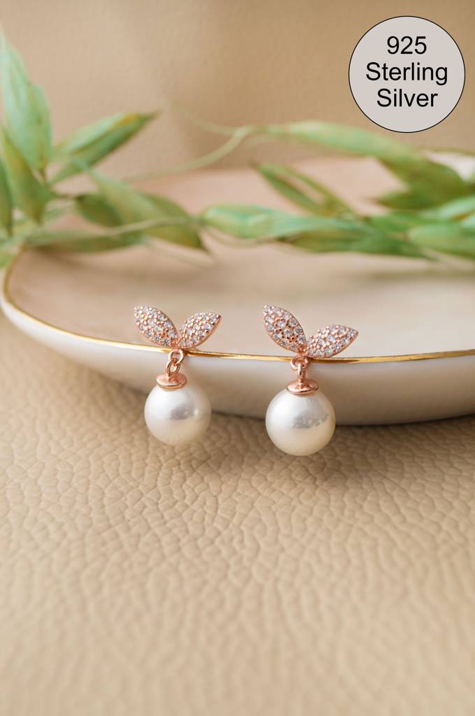 MannashPetal & Pearl Drop Rose Gold Plated Sterling Silver Earrings