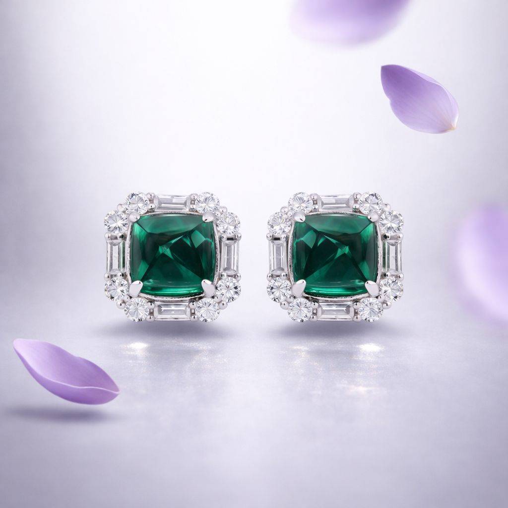 Twenty One JewelsPremium Green Emerald Cabochon Shukra Statement Stud Earrings With Screw Backs On Pure 925 Silver