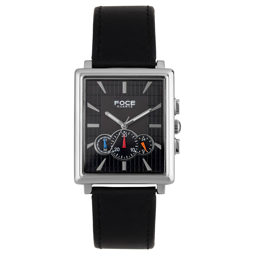 FOCEPremium Men'S Square Multifunction Watch With Silver Case, Black Leather Strap, Day, Date, And 24-Hour Subdials, Model F729Gsl