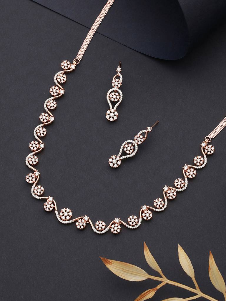 Rose Gold Plated Ad Studded Floral Minimal Necklace Jewellery Set : SJNK2363