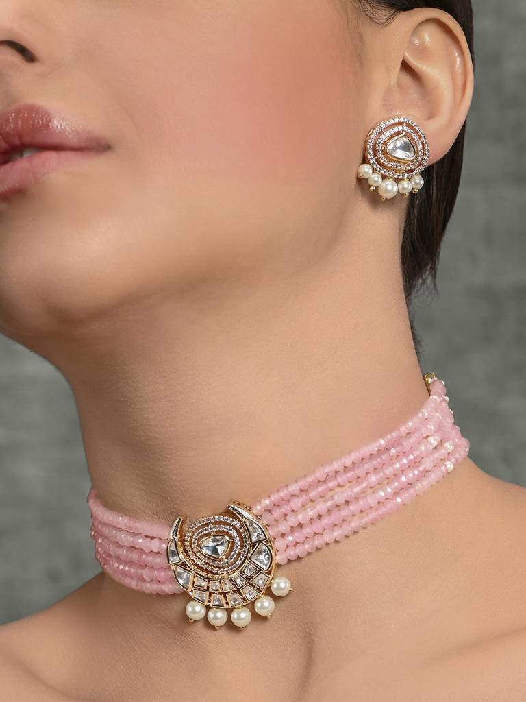 Scintillating Pink Beaded Choker With Earrings : JBRMR24NKS45